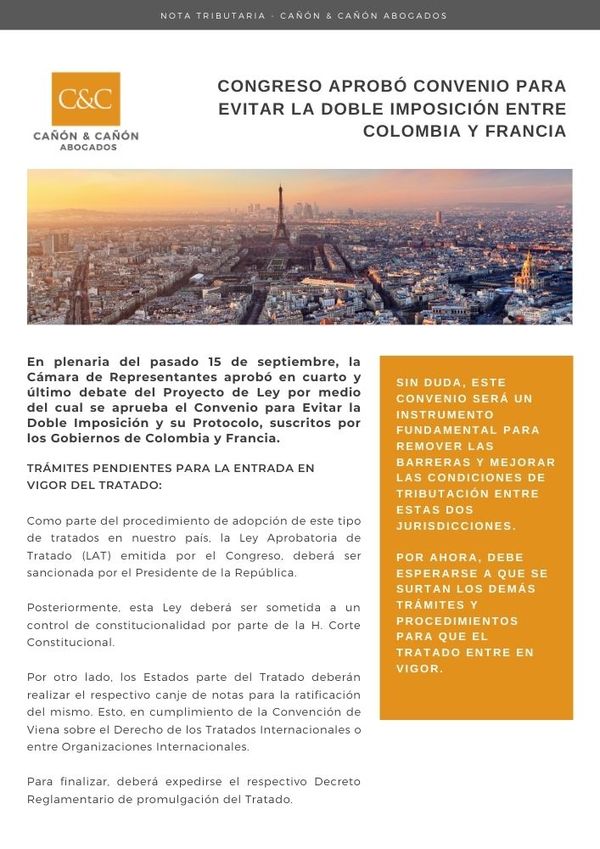 Actualités • Noticias de empresas Congreso aprobó convenio para evitar la doble imposición entre Colombia y Francia 23 septiembre 2020 Cañón & Cañón AbogadosTel: (+571) 6918311www.canonycanon.comCalle 99 No. 7a - 77.Bogotá, Colombia