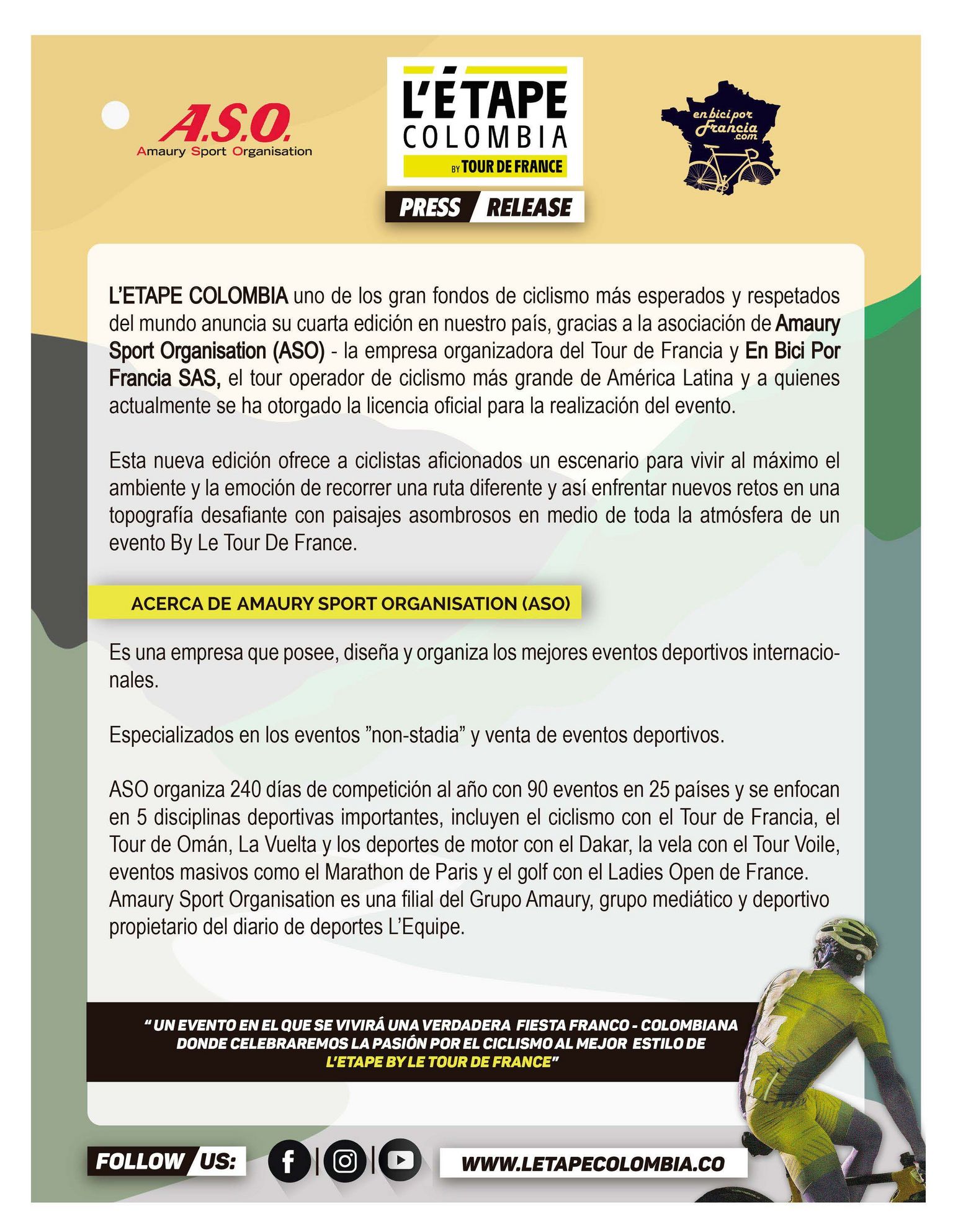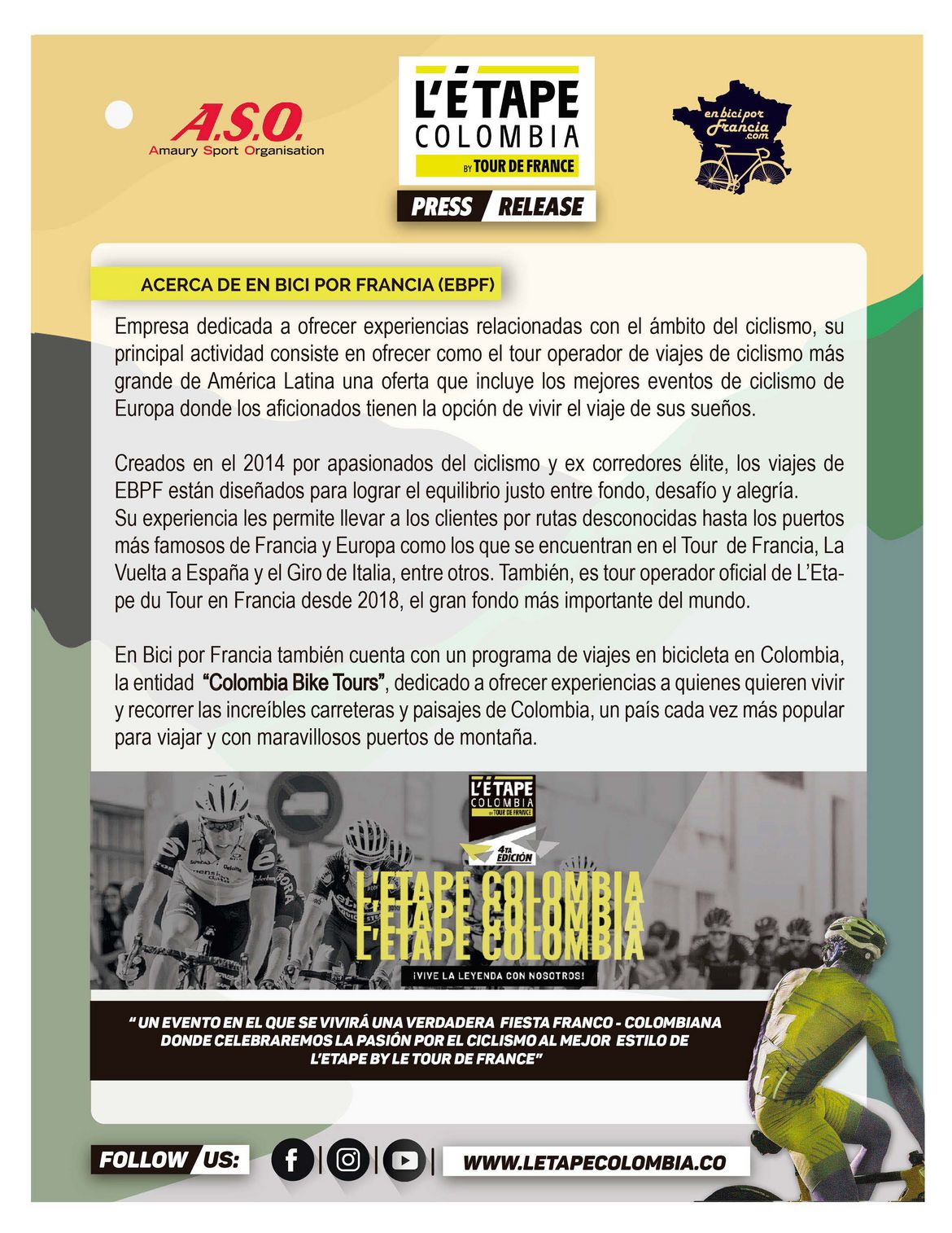 Noticias de empresas • Comunicación – Prensa Descubra l’Etape Colombia by Tour de France 5 marzo 2021 Para participar en este evento y consultar mayor información, visite: www.letapecolombia.co Instagram Facebook