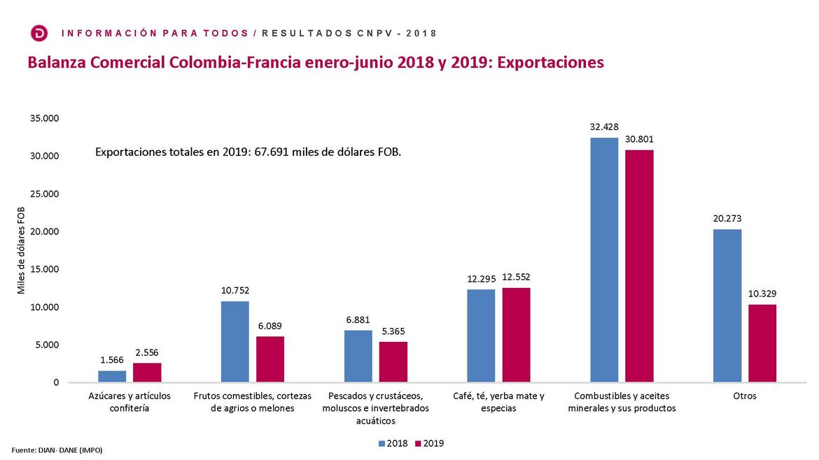 A Colombia le hace falta ver cómo va a generar oportunidades en manufactura básica en sus exportaciones hacia Francia, o cómo va a fortalecer las exportaciones de servicios, lo más importante dentro de la canasta de las exportaciones de Colombia a Francia son combustibles, aceites minerales, café, pescados, crustáceos, frutos comestibles. Una dinámica relevante, en la que Colombia puede tener un espacio de mercado importante por competitividad de empresas, es en azucares y confitería en el mercado francés. Este es el único componente de la canasta que tiene un crecimiento bien importante de Colombia hacia Francia.