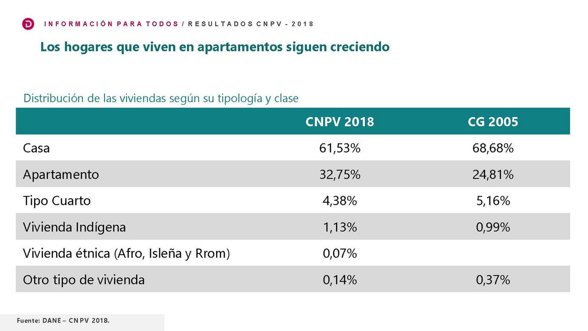 La cifra de hogares que viven en apartamentos sigue creciendo. Se han dado cambios en los bienes y servicios asociados con la convivencia en apartamentos en Colombia antes el 25% de las unidades habitacionales eran apartamentos, actualmente es del 33%, y en las principales ciudades Bogotá, Medellín, Barranquilla Cali, la prevalencia es de más del 50%, lo cual significa que los modelos de convivencia habitacional cambian, pero también cambia la demanda de productos y servicios, por ejemplo, la venta de frutas porcionadas es respuesta a un perfil de demanda en la cual ha crecido significativamente la participación de hogares unipersonales.