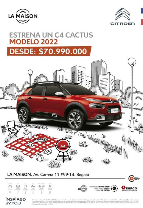 (*)Precio aplica a Citroën C4 Cactus versión Feel 1,6 AT modelo 2022e incluye bono de descuento sobre lista de precios por valor de $6.160.000. Precio y oferta válida para vehículos separados entre el 7.05.2021 al 15.05.2021 y facturados a cliente final entre el 7.05.2021 y el 30.05.2021. Oferta de vitrina Citroën LA MAISON, No acumulable con otros descuento o acciones comerciales.