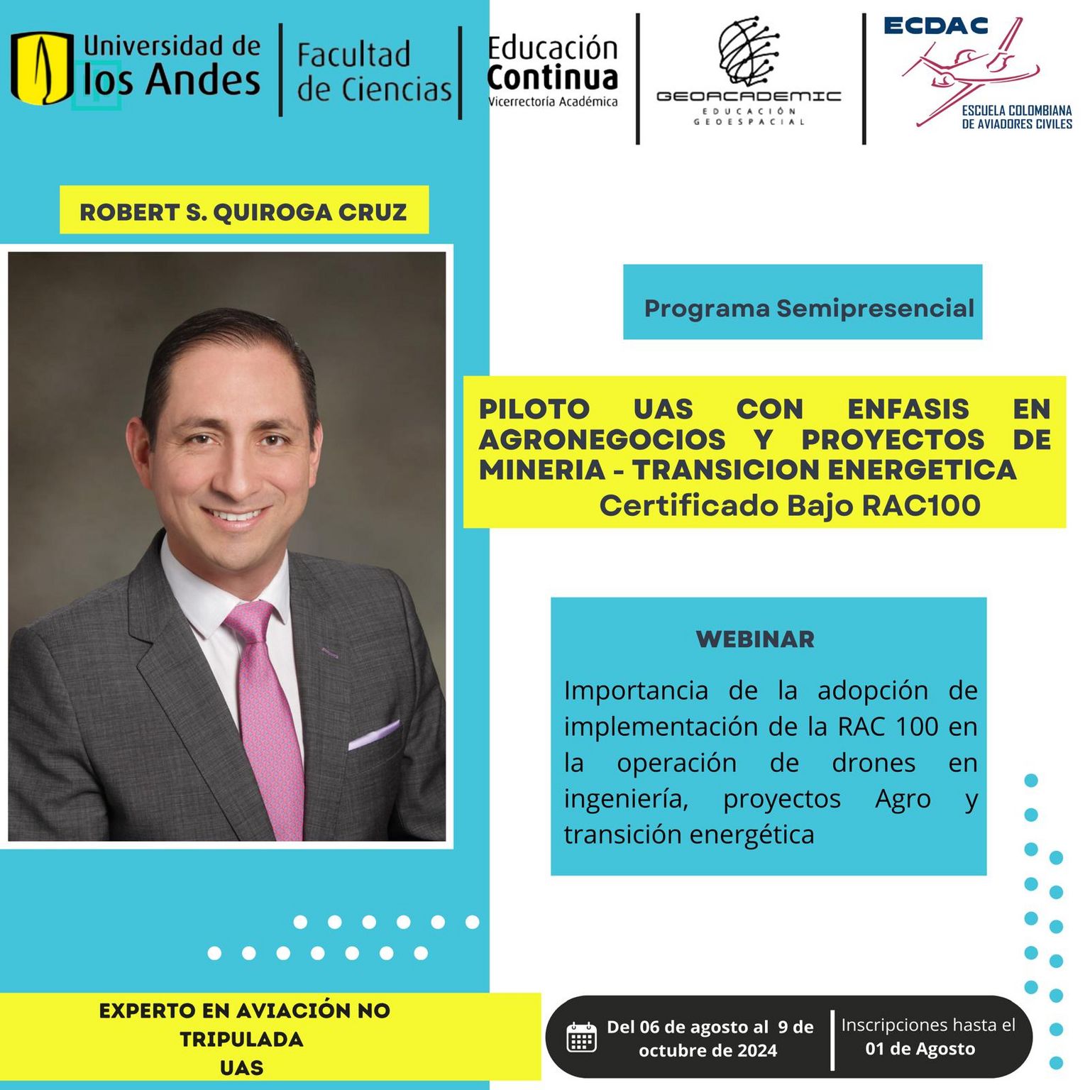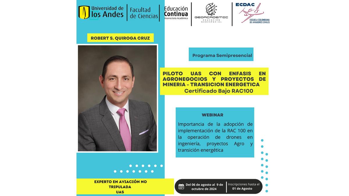 Este programa, ofrecido por el Departamento de Geociencias de la Universidad de los Andes y GeoFintech/Geoacademic, está diseñado para proporcionarte los conocimientos necesarios para el uso eficiente y seguro de drones, cumpliendo con la normatividad vigente RAC 100.