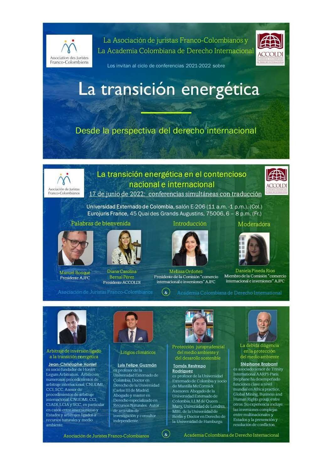 La Asociación de Jurístas Franco Colombianos se complace en invitarlos a un coloquio el viernes 17 de junio de 2022, sobre la transición energética en los litigios nacionales e internacionales.