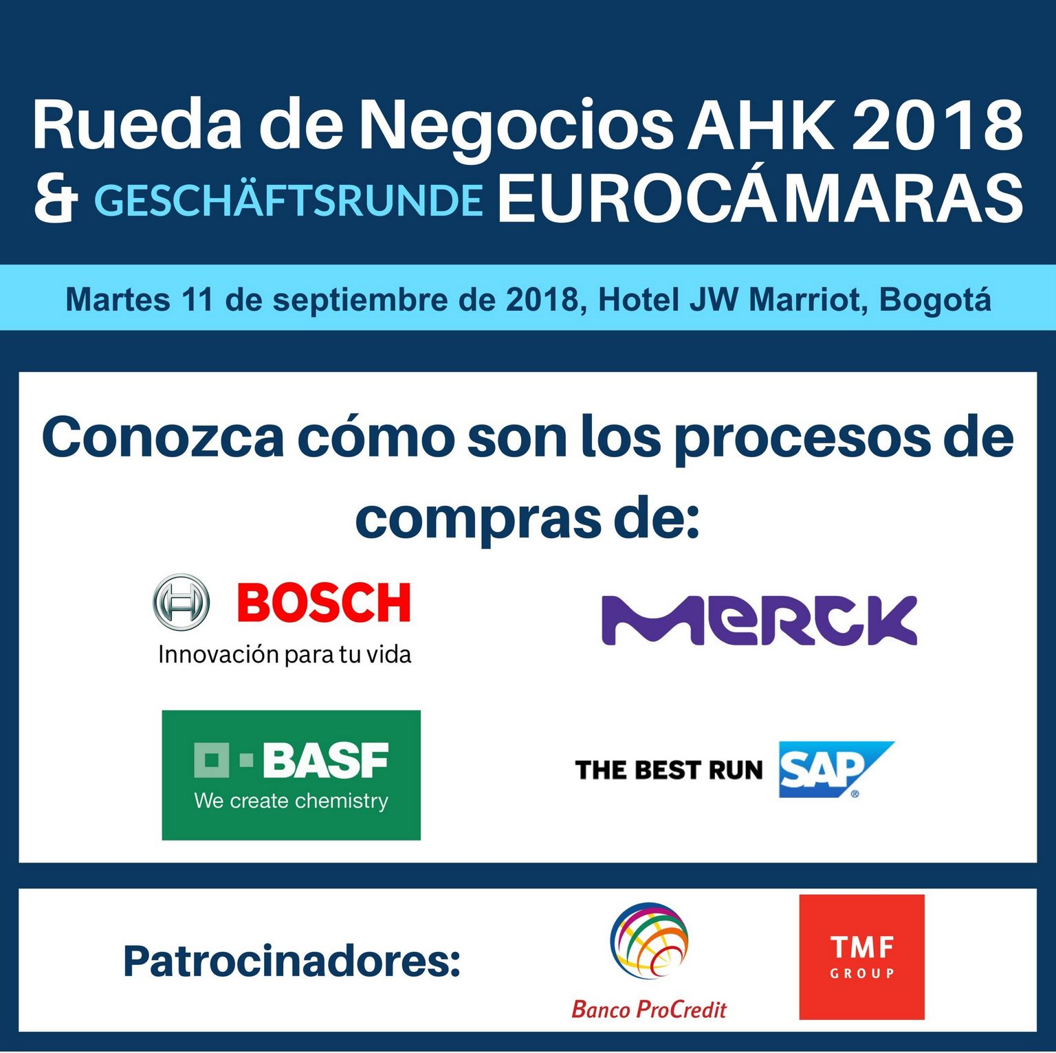 La Rueda de Negocios AHK 2018 – Geschäftsrunde & EUROCÁMARAS, se llevará a cabo el 11 septiembre de 2018 en Bogotá en el Hotel JW MARRIOT.