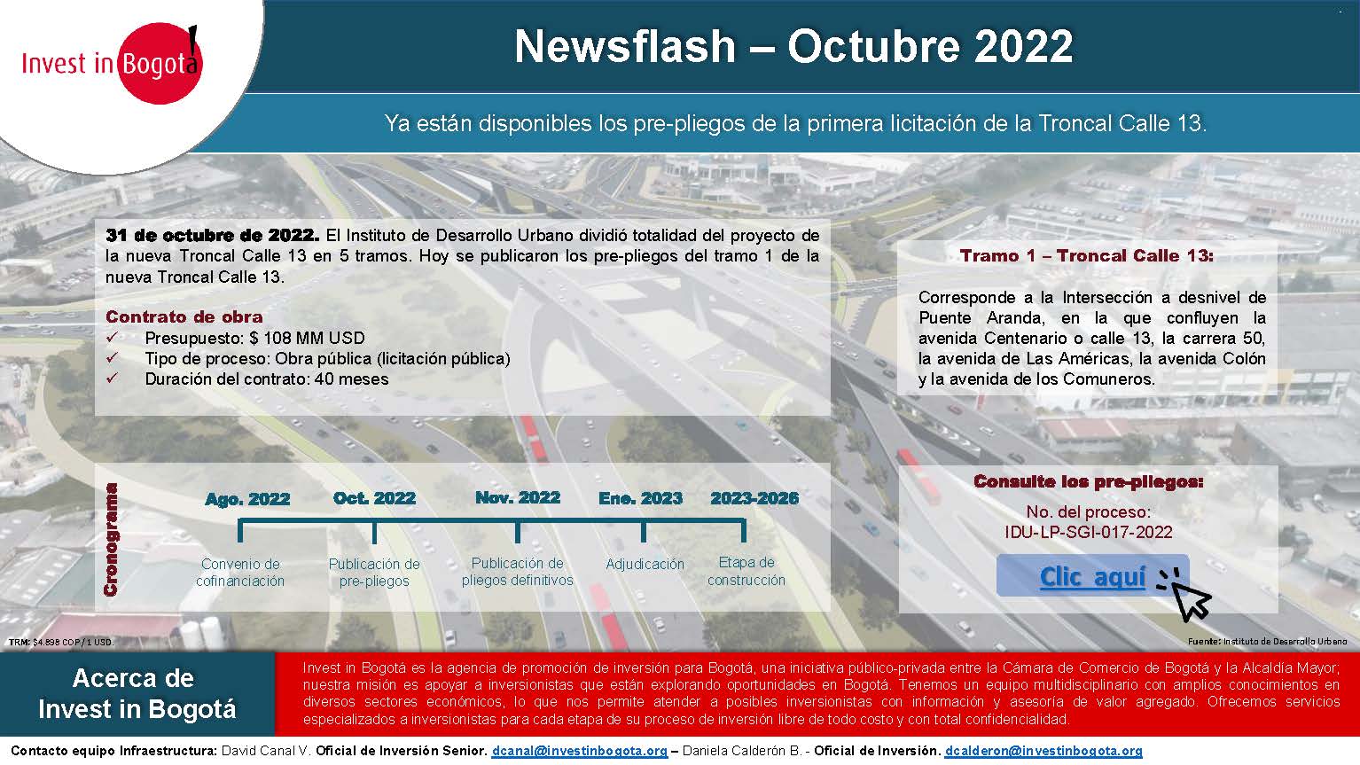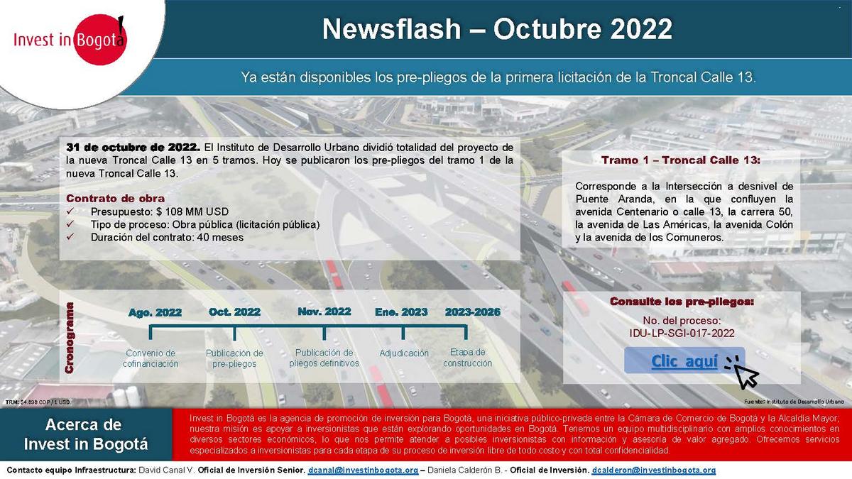 Licitaciones & Oportunidades de negocios Se encuentra abierta licitación para las obras en la troncal calle 13 1 noviembre 2022 Descubran el cronograma y el link para acceder a los prepliegos Consulten los prepliegos siguiente este link: IR AL secop