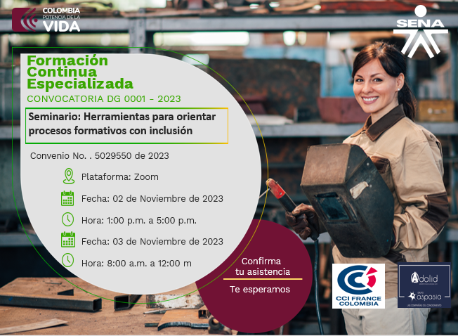 El Programa de Formación Continua Especializada del SENA, CÁMARA DE COMERCIO E INDUSTRIA FRANCE COLOMBIA - CCI FRANCE COLOMBIA. Adalid Inmark, Entidad capacitadora. A través de la Transferencia de Conocimiento y Tecnología, tenemos el gusto de invitarlo(a) a participar en el Seminario "Herramientas para orientar procesos formativos con inclusión”, que se llevará a cabo los días 02 de noviembre de 1:00 p.m. a 5:00 p.m. y 03 del mes de Noviembre de 2023 de 8:00 a.m. a 12:00 m en la plataforma Zoom