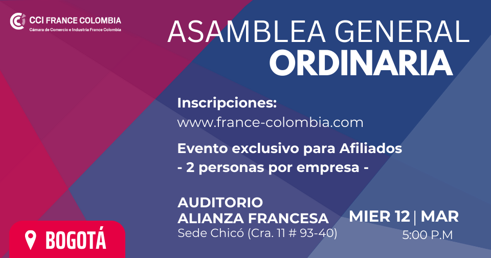 Le Conseil d’Administration de la Chambre de Commerce et d’Industrie France Colombia (ci-après la “CCI France Colombia”), dans l’exercice de ses pouvoirs légaux et statutaires, convoque par la présente l’Assemblée Générale Ordinaire de la CCI France Colombia, qui se tiendra en présentiel le mercredi douze (12) mars de l’année deux mille vingt-cinq (2025), à dix-sept heures (17h00) à Bogotá D.C., dans l’Auditorium de l’Alliance Française - Chicó (Cra. 11 # 93-40).