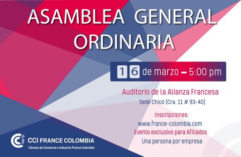 Le Conseil d'Administration de la Chambre de Commerce et d'Industrie France Colombia (ci-après la " CCI France Colombia "), dans l'exercice de ses pouvoirs légaux et statutaires, vous invite par la présente à l'Assemblée Générale Ordinaire de la CCI France Colombia, qui se tiendra en personne le seize (16) mars de l'année deux mille vingt-deux (2022), à cinq heures de l'après-midi (17h00) à Bogotá D.C. dans l'Auditorium de l'Alliance Française - Chicó (Cra. 11 # 93-40).