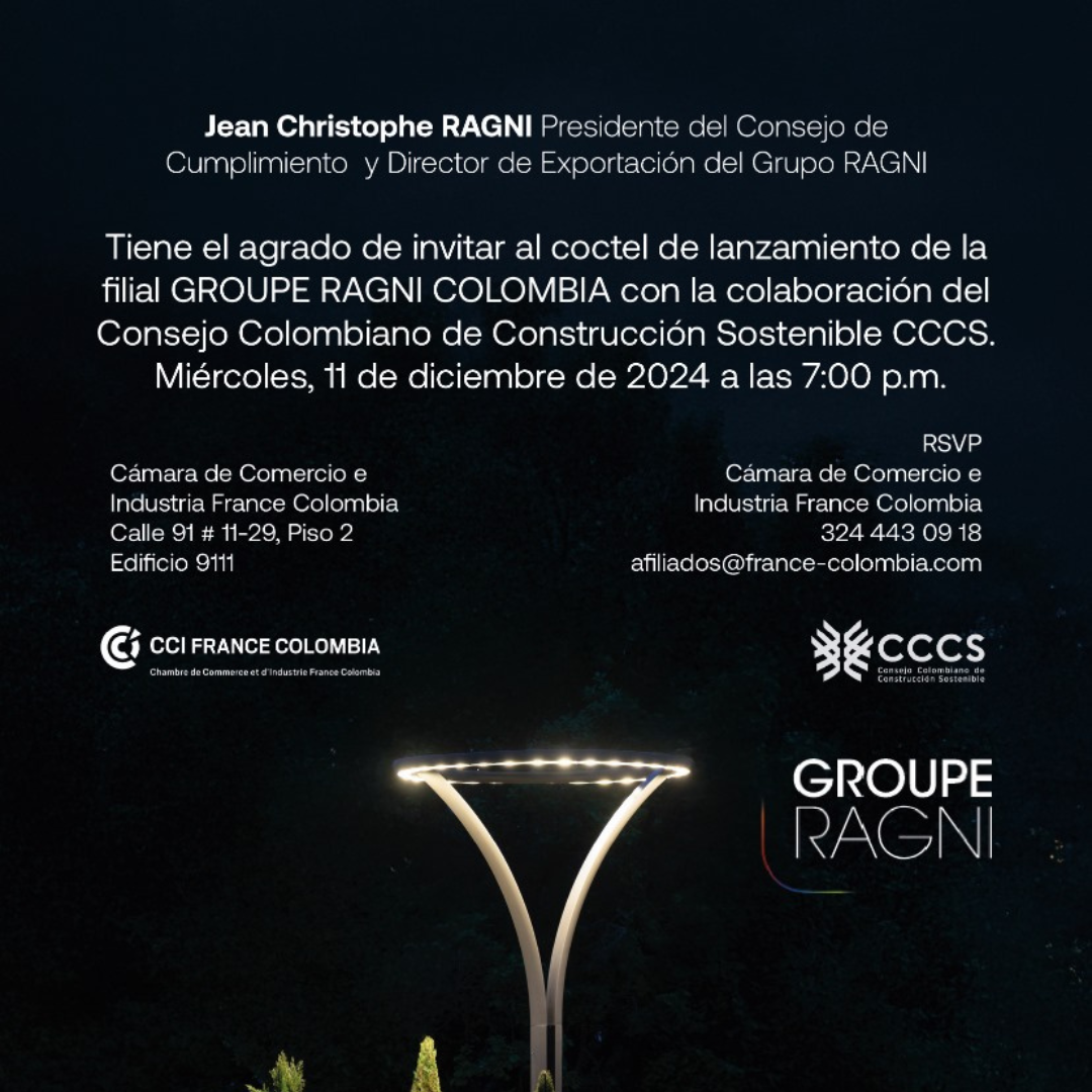 Jean Christophe Ragni, Président du Conseil de Conformité et Directeur d’Exportation du Groupe Ragni, a le plaisir de vous convier au cocktail de bienvenue organisé à l’occasion du lancement officiel de la filiale Groupe Ragni Colombia.