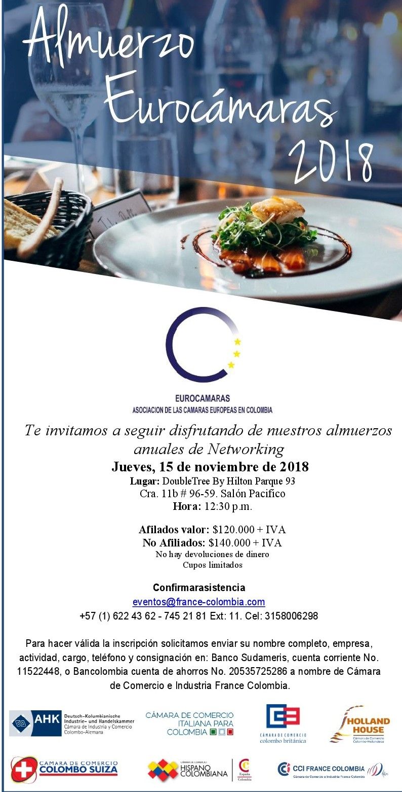 Pour que l'enregistrement soit valide, nous vous demandons d'envoyer votre nom complet, celui de votre société, votre activité, votre poste, votre téléphone et votre envoi à: Banco Sudameris, compte chèque n ° 11522448 ou compte d'épargne Bancolombia n ° 20535725286 au nom de la Chambre de commerce et d'industrie France Colombie.