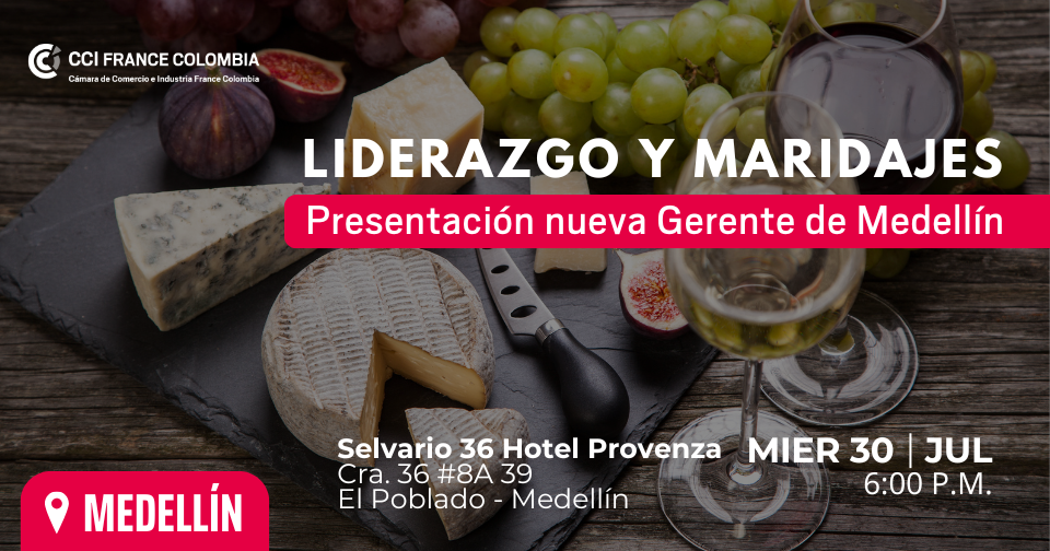 Rejoignez-nous ce mercredi 30 juillet à 18h00 à l’hôtel Selvario 36 pour une soirée exclusive autour d'une dégustation de vins et de fromages. Ce sera l’occasion idéale de faire connaissance de notre nouvelle gérante du siège de Medellín de la CCI France Colombia, de renforcer les liens au sein de la communauté d’affaires franco-colombienne, et de profiter d’une expérience sensorielle.