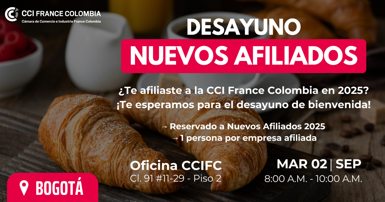 La CCI France Colombia a le plaisir de convier ses nouveaux affiliés 2025 à un petit-déjeuner de bienvenue, le mardi 2 septembre 2025, dans nos bureaux à Bogotá.