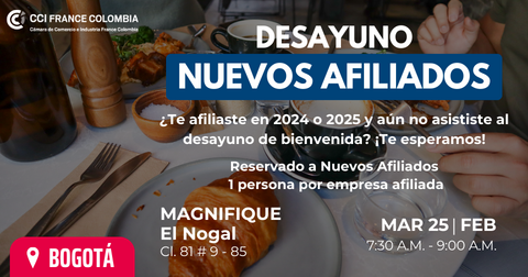La CCI France Colombia a le plaisir d'inviter ses nouveaux affiliés à un petit-déjeuner exclusif de bienvenue. Cet événement est réservé aux entreprises qui ont rejoint la CCI en 2024 ou 2025 et qui n'ont pas encore eu l'occasion d'y participer.
